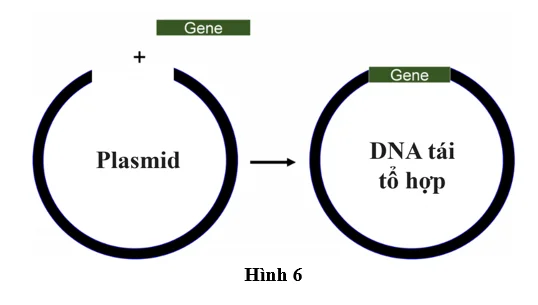 Câu 16: Hình 6 minh họa quy trình tạo DNA tái tổ hợp trong công nghệ gene. Một gene mong muốn được tách ra từ DNA nguồn và gắn vào phân tử plasmid để tạo thành DNA tái tổ hợp. DNA tái tổ hợp này sau đó có thể được đưa vào tế bào nhận để gene mong muốn được biểu hiện .