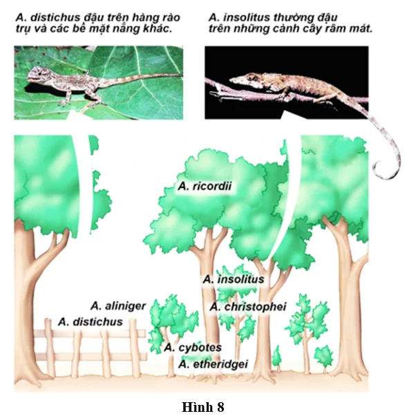 Câu 17: Hình 8 minh họa sự phân hóa ổ sinh thái của các loài thằn lằn thuộc chi Anolis sống trong cùng một khu vực rừng. Mặc dù có nguồn gốc tiến hóa gần nhau, mỗi loài này lại chiếm giữ một vị trí sống khác nhau trên cây hoặc môi trường xung quanh (thân cây, cành cao, cành râm mát, hàng rào, mặt đất…). Dựa vào hình trên, hiện tượng sinh thái nào được minh họa rõ nhất?