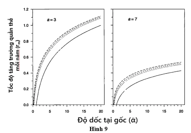 Câu 18: Hình 9 trên biểu diễn mối quan hệ giữa tốc độ tăng trưởng tối đa của quần thể (rₘ) và độ dốc tại gốc (ᾱ) đại diện cho khả năng tăng...