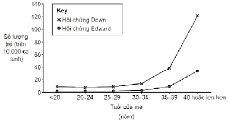 Câu 18: Hình bên trình bày tương quan giữa tỷ lệ trẻ em sinh ra mắc hội chứng Down hoặc hội chứng Edward và tuổi của mẹ. Phát biểu nào sau đây không đúng?