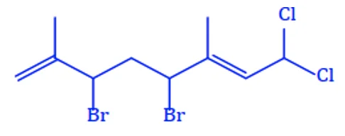 Câu 19: Hàng nghìn các dẫn xuất halogen được tách ra từ nhiều loại sinh vật biển khác nhau như rong, tảo biển, san hô,… Chúng có các hoạt tính sinh học rất quý giá như khả năng điều trị bệnh ung thư và nhiều bệnh khác. Cho công thức cấu tạo của dẫn xuất halogen Laurencia như sau: