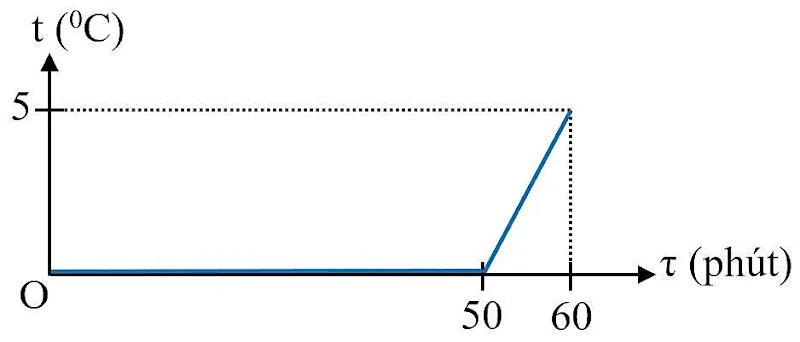 Sử dụng các thông tin sau cho Câu 2 và Câu 3: Một chậu có chứa 2,6 kg hỗn hợp nước và nước đá đều ở nhiệt độ 0 °C và được đặt trong phòng kín. Sự thay đổi nhiệt độ của hỗn hợp theo thời gian được biểu diễn bằng đồ thị như hình bên dưới. Biết nhiệt dung riêng của nước là 4200 J/(kg.K), nhiệt nóng chảy riêng của nước đá là 3,4.105 J/kg. Cho rằng sự hấp thụ nhiệt từ môi trường là đều.