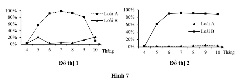Câu 2. Hai loài động vật không xương sống A và B cùng sinh sống ở vực nước biển ôn đới, chúng có giai đoạn trưởng thành sống cố định, ăn các mảnh vụn hữu cơ. Hằng năm, chúng bắt đầu sinh trưởng từ cuối tháng 3 khi nhiệt độ nước tăng lên và chết từ cuối tháng 9 khi nhiệt độ nước giảm xuống. Cá săn mồi xuất hiện ở một vài nơi trong khu vực này và ăn động vật không xương sống trong đó có 2 loài A và B. Độ che phủ của 2 loài A và B được nghiên cứu ở một số địa điểm khi các loài động vật không xương sống được bảo vệ khỏi cá săn mồi (Đồ thị 1) và không được bảo vệ khỏi cá săn mồi (Đồ thị 2).