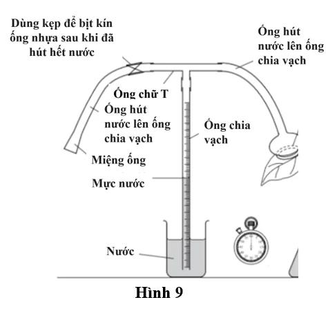 Câu 2. Một nhóm học sinh tiến hành thí nghiệm đo tốc độ thoát hơi nước của cây bằng ống đo potometer như Hình 9. Lá cây được gắn kín với một cốc nhỏ để thu hơi nước thoát ra, nước trong bình và ống chia độ được nối kín hệ thống (các mối nối kín hoàn toàn và hệ thống không bị rò rỉ). Khi lá cây thoát hơi nước, nước bị hút lên trong ống chia độ, mực nước dịch chuyển được ghi lại trong một khoảng thời gian xác định bằng đồng hồ bấm giờ.