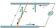 Câu 2. Một thanh đồng được đặt lên hai giá đỡ song song, dẫn điện như hình. Bỏ qua ma sát giữa thanh đồng và giá đỡ. Một nguồn điện G được gắn vào mạch để duy trì dòng điện không đổi qua mạch. Chiều của dòng điện được vẽ như trong hình, cường độ dòng điện là Thanh đồng có khối lượng hai giá đỡ cách nhau một khoảng Hệ được đặt trong vùng từ trường đều có vector cảm ứng từ vuông góc với mặt phẳng chứa thanh đồng và giá đỡ, hướng như trong hình. Độ lớn của cảm ứng từ là