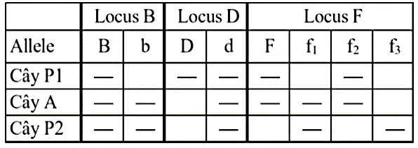 Câu 2: Ở một loài lúa, xét 3 locus B, D, F lần lượt quy định các tính trạng độ dày lá, hình dạng lá và độ dài của bông. Thực hiện một phép lai giữa cây P₁ và cây P2 thu được thế hệ F1, trong số các cây F₁ tạo ra có xuất hiện 1 cây A có kiểu hình bất thường. Nhờ phân tích hàm lượng và thành phần các allele của cây P1, P2 và cây A trong kết quả điện di đã xác định được 2 locus B, F nằm trên cùng một cặp NST tương đồng, locus D nằm trên một cặp NST tương đồng khác, không xảy ra đột biến cấu trúc NST. Kết quả thành phần các allele được thể hiện ở bảng sau đây:
