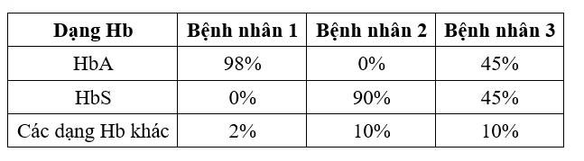 Bảng bên dưới cho biết tỉ lệ % HbA và HbS trong máu của 3 bệnh nhân