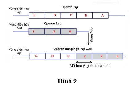 Bằng kỹ thuật gây đột biến và chuyển đoạn, người ta đã tạo ra được vi khuẩn E.Coli mang operon dung hợp giữa operon Trp và operon Lac như hình.