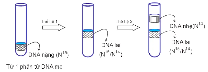 b) Sau một thế hệ trong môi trường chứa 14N: những phân tử DNA gồm một chuỗi nặng 15N (chuỗi mẹ) và một chuỗi nhẹ 14N (mới được tổng hợp).