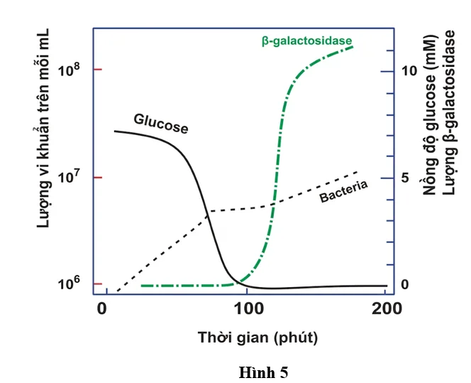Câu 2. Vi khuẩn E.coli sinh trưởng trên môi trường có nguồn dinh dưỡng là đường đơn nhanh hơn so với đường đôi. Khi nuôi cấy E.coli trên môi trường chứa hỗn hợp đường glucose và lactose, nó sinh trưởng với quá trình tương đối phức tạp. Trong quá trình này nồng độ đường glucose, lượng enzyme β-galactosidase và nồng độ tế bào vi khuẩn được theo dõi và ghi lại thể hiện trên Hình 5 trong khoảng thời gian gần 200 phút kể từ thời điểm bắt đầu bổ sung vi khuẩn vào môi trường. Biết rằng, quá trình phiên mã các gene cấu trúc của operon Lac chỉ xảy ra mạnh mẽ khi có sự gắn kết của phức hợp cAMP-CRP vào vùng khởi động (P) và glucose có tác dụng ức chế nồng độ cAMP.