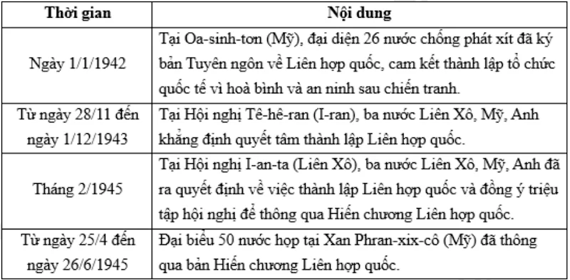 c) Quá trình thành lập Liên hợp quốc diễn ra kéo dài với nhiều sự kiện quan trọng thể hiện sự nỗ lực vì hòa bình chung của cộng đồng quốc tế.