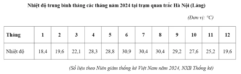Câu 3: Cho bảng số liệu: Căn cứ vào bảng số liệu trên, hãy cho biết biên độ nhiệt độ không khí trung bình của năm 2024 tại trạm quan trắc Hà...
