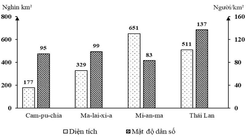 Câu 3: Cho biểu đồ sau: Diện tích, mật độ dân số một số quốc gia Đông Nam Á năm 2021 (Nguồn: Niên giám thống kê 2021, NXB Thống kê, 2022) Nă...