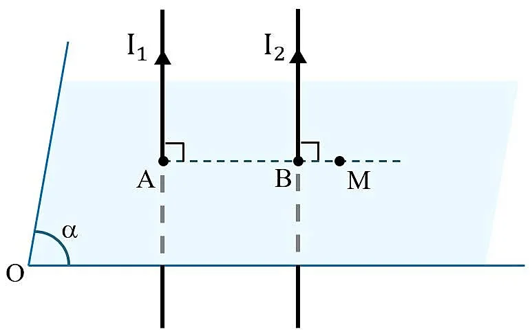 Câu 3. Cho hai dây dẫn thẳng dài vô hạn đặt song song cách nhau một đoạn bằng 32 cm. Dòng điện chạy qua các dây dẫn có cường độ lần lượt là và Xét mặt phẳng (α) nằm ngang và vuông góc với mặt phẳng tạo bởi hai dây dẫn, mặt phẳng này cắt hai dây dẫn mang dòng điện và lần lượt tại hai điểm A và B như hình vẽ. Xét điểm M nằm trên đường thẳng AB và nằm ngoài AB, biết BM = 8 cm. Độ lớn cảm ứng từ tại một điểm trong từ trường do dòng điện chạy trong dây dẫn thẳng gây ra được xác định bằng công thức (T) (với I là cường độ dòng điện, đơn vị ampe (A); r là khoảng cách từ điểm đó đến dây dẫn, đơn vị mét (m)).