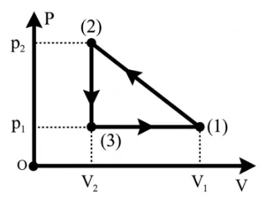 Câu 3: Có 20,0 g khí helium (He) chứa trong một xi-lanh được đậy kín bởi pittông. Hình vẽ bên biểu diễn hai quá trình chuyển trạng thái liên tiếp từ (1) → (2) → (3) của lượng khí trên trong hệ tọa độ (p, V). Cho rằng khí He trong xi-lanh là một khí lí tưởng. Biết V1 = 30,0 lít; p1 = 5,0 atm; V2 = 10,0 lít; p2 = 15,0 atm; khối lượng mol nguyên tử của helium là 4,0 g/mol; 1 atm = 101325 Pa. Cho biết R = 8,31 J.mol−1. K−1.