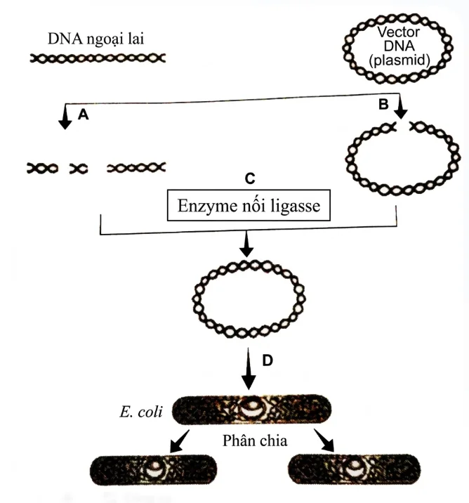 Câu 3: Công nghệ DNA tái tổ hợp là một bước đột phá trong sinh học hiện đại, cho phép các nhà khoa học cắt một đoạn gene mong muốn từ sinh vật này và gắn vào một phân tử vận chuyển (vector) để đưa vào tế bào chủ (thường là vi khuẩn E. coli). Hình 10 thể hiện các bước then chốt: cắt DNA bằng enzyme giới hạn, nối đoạn gene vào plasmid bằng enzyme ligase, và cuối cùng là đưa DNA tái tổ hợp vào tế bào nhận để nhân bản hoặc sản xuất protein.