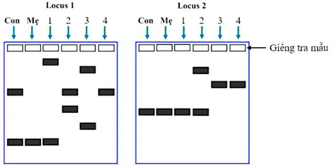 Câu 3: Dưới đây là bản gel điện di các mẫu DNA (ở hai locus thuộc 2 nhiễm sắc thể khác nhau) của một người con, một người mẹ và bốn người đà...