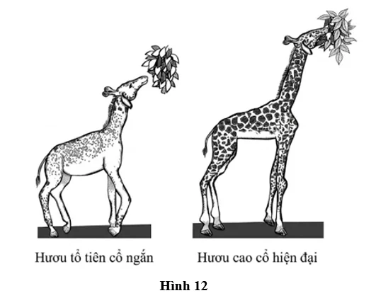 Câu 3. Khoảng vài triệu năm trước, ở các vùng đồng cỏ và rừng thưa châu Phi, nguồn thức ăn dưới thấp dần trở nên khan hiếm do khí hậu thay đổi, cạnh tranh giữa các loài ăn cỏ, cây cối phát triển cao hơn. Trong quần thể hươu cổ xưa, có những cá thể cổ ngắn hơn và những cá thể cổ dài hơn một chút do biến dị tự nhiên. Hình 12 mô tả hươu cao cổ tổ tiên ancestral giraffe và hươu cao cổ hiện đại modern giraffe đang ăn lá cây trên cao.