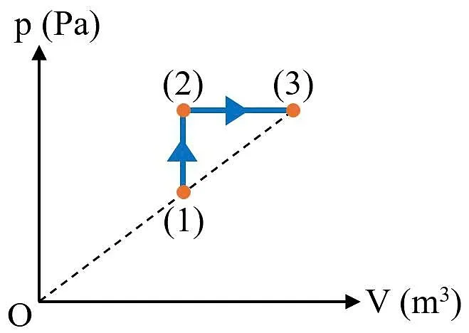 Câu 3. Một khối khí lí tưởng thực hiện quá trình biến đổi trạng thái được biểu diễn như hình vẽ bên dưới. Nhiệt độ của khối khí ở trạng thái (1) và (3) lần lượt là 300 K và 525 K. Nhiệt độ của khối khí ở trạng thái (2) bằng bao nhiêu kelvin (K)? (Làm tròn kết quả đến chữ số hàng đơn vị)