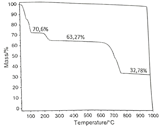 Câu 3: Một nhà hóa học trẻ quyết định nghiên cứu về sự nhiệt phân muối cobalt(II) sulfate pentahydrate để phục vụ cho dự án khoa học của mình. Để tiến hành, anh ta đặt một mẫu muối màu hồng tươi vào thiết bị phân tích nhiệt trọng (TGA) và bắt đầu quá trình đun nóng đến . Kết quả là anh ta nhận được đồ thị về sự phụ thuộc của khối lượng mẫu vào nhiệt độ như trong hình bên. Số nguyên tử trong một phân tử mẫu ở là bao nhiêu?