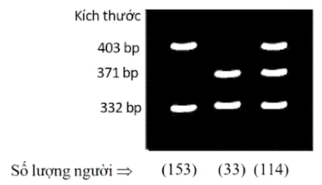 biến của gene bị mất một đoạn DNA dài 32 bp (cặp nucleotide), được gọi là đột biến CCR5432, giúp người mang đột biến kháng sự lây nhiễm của virus. Một quần thể người gồm 300 cá thể được nghiên cứu gene này. Phân đoạn gene đích được khuếch đại bằng PCR, rồi được cắt bằng enzym giới hạn và phân tách trên gel điện di agarose. Kết quả thu được như hình bên.