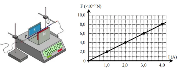 Câu 3. Một nhóm học sinh tiến hành thí nghiệm đo độ lớn cảm ứng từ B của từ trường đều của nam châm chữ U với bộ thí nghiệm cân lực từ như hình. Chiều dài dây dẫn PQ mang dòng điện đặt trong từ trường đều bằng 15 cm và thu được kết quả sự phụ thuộc của lực từ tác dụng lên đoạn dây theo cường độ dòng điện đi qua dây như đồ thị bên dưới. Biết dây dẫn vuông góc với các đường sức từ của nam châm và cùng nằm trên mặt phẳng nằm ngang.