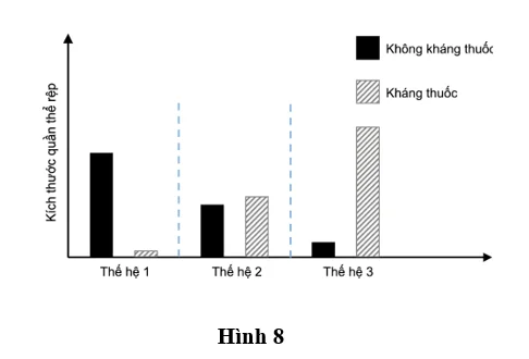 Câu 3. Một phòng thí nghiệm nuôi cấy vi khuẩn đã sử dụng kháng sinh liên tục trong thời gian dài để kiểm soát sự phát triển của quần thể. Biểu đồ dưới đây thể hiện số lượng vi khuẩn kháng kháng sinh và không kháng kháng sinh qua ba thế hệ.