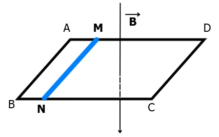 Câu 3. Một thanh dây dẫn MN trượt trên khung dây kim loại kín hình chữ nhật ABCD đặt trong từ trường đều có độ lớn cảm ứng từ B = 0,4 T được mô tả như hình vẽ. Các đoạn dây dẫn làm khung có tiết diện đều, đồng chất và có điện trở RABCD = 16,0 Ω. Thanh MN trượt đều với tốc độ 10,0 m/s sao cho M tiếp xúc với cạnh AD, N tiếp xúc với cạnh BC, MN song song với AB và thanh trượt về phía bên phải. Biết điện trở của thanh MN là rMN = 1,0 Ω, MN = AB = CD = 20 cm.