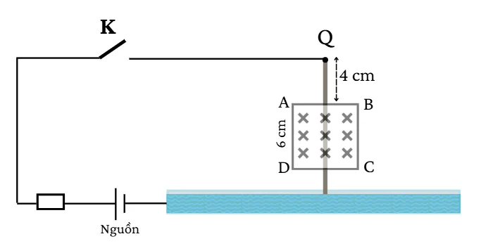 Câu 3. Một thanh kim loại nhẹ có thể quay tự do quanh trục Q, trong khi đầu bên dưới của nó chỉ chạm vào một chất lỏng dẫn điện trong bình kim loại. Một từ trường đều được áp dụng trên vùng ABCD và chứa một phần của thanh như hình vẽ. Khi công tắc K đóng, thanh bị văng ra khỏi bề mặt chất lỏng. Moment lực từ ban đầu khiến thanh văng ra là 1,4.10–3 Nm.