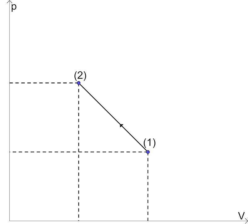 Sử dụng các thông tin sau cho câu 3 và câu 4: Một mol khí Helium chứa trong cylinder đậy kín bởi piston nhẹ, khí biến đổi từ trạng thái (1) sang trạng thái (2) như đồ thị bên dưới. Biết V1 = 2V2 = 20 dm3, p1 = 1,5.105 Pa, p2 = 3,0.105 Pa.