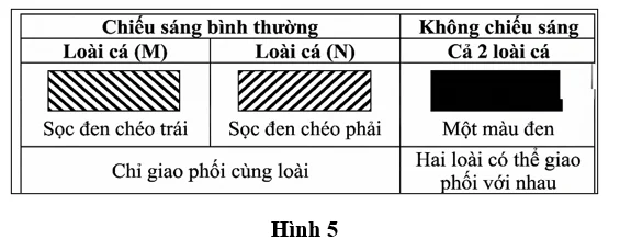 Câu 3. Ở hai loài cá cùng chi sống trong hồ nước ngọt, con cái lựa chọn bạn tình dựa vào hoa văn trên cơ thể con đực trong mùa sinh sản. Khi môi trường có ánh sáng đầy đủ, loài M có sọc đen chéo trái, loài N có sọc đen chéo phải nên chỉ giao phối cùng loài. Tuy nhiên, khi môi trường bị đục hoặc thiếu ánh sáng, hoa văn này không còn phân biệt rõ, khiến hai loài có thể giao phối với nhau. Các nghiên cứu bổ sung cho thấy con lai giữa hai loài có thể hình thành nhưng khả năng sinh sản chưa được xác định rõ.. Màu sắc trên lưng cá và hình thức sinh sản của hai loài cá (M và N) được mô tả như hình: