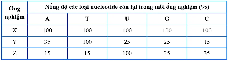 Khi tiến hành đo so ý, nhãn đánh dấu các ống nghiệm bị nhòe không còn phân biệt được các ống nghiệm I, II và III nên nhóm nghiên cứu đặt giả tạm thời lại các nhãn là X, Y, Z và xác định tỉ lệ các loại nucleotide tự do A, T, U, G, C còn lại trong mỗi ống nghiệm sau một thời gian thí nghiệm để đánh dấu lại và thu được kết quả như sau: