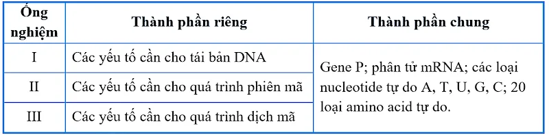 Câu 3: Thí nghiệm tổng hợp DNA, RNA, protein nhân tạo bằng cách bố trí ba ống nghiệm I, II, III và bổ sung thêm các thành phần như ở bảng sa...
