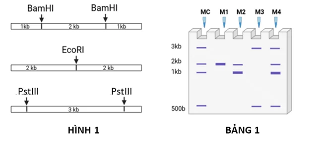 Hình 1 và Bảng 1 là kết quả điện di 4 mẫu DNA của một người trưởng thành được xử lý bằng hỗn hợp enzyme cắt giới hạn, trong đó: Mẫu 1 và mẫu 2, 3 được cắt bởi một loại enzyme duy nhất. Mẫu 4 được cắt bởi hỗn hợp hai enzyme.