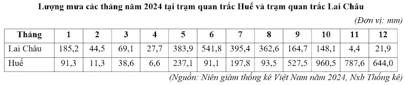 Căn cứ vào bảng số liệu trên, hãy cho biết năm 2024, tháng có lượng mưa lớn nhất tại trạm quan trắc Huế cao hơn tháng có lượng mưa lớn nhất tại trạm quan trắc Lai Châu là bao nhiêu mm? (làm tròn kết quả đến hàng đơn vị).