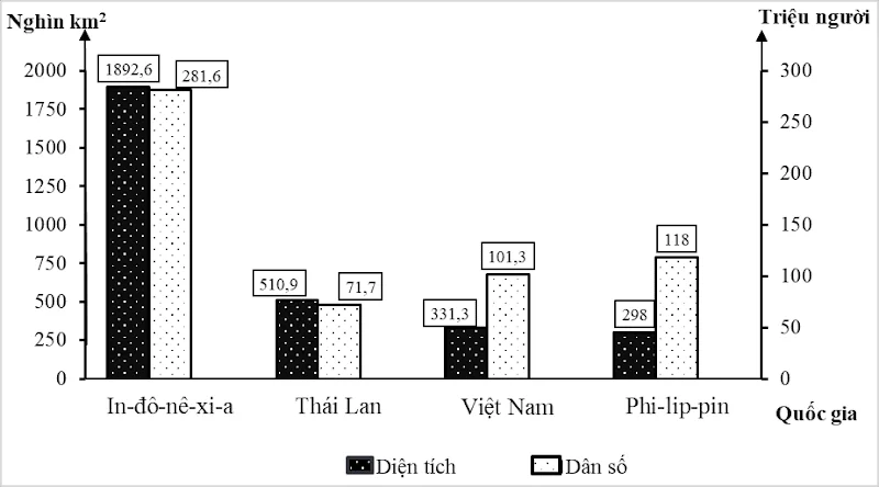Câu 4. Cho biểu đồ: Biểu đồ diện tích và dân số của một số quốc gia Đông Nam Á năm 2024 (Nguồn: Niêm giám thống kê Việt Nam năm 2024, Nxb th...