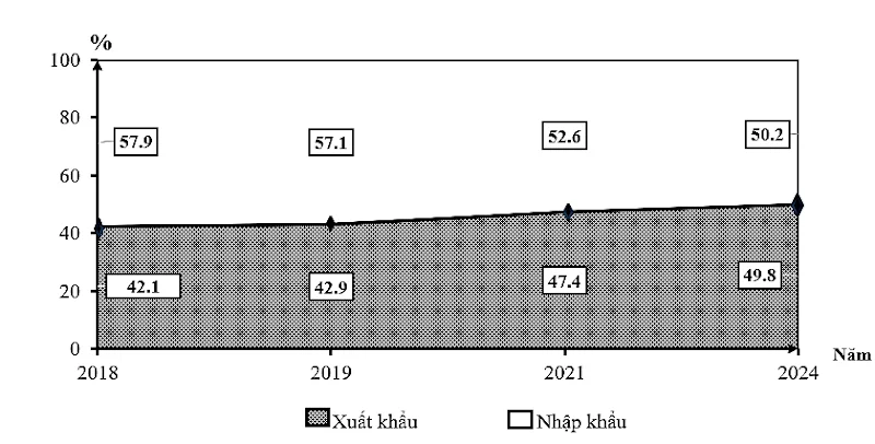 c) Năm 2024, tỉ trọng nhập khẩu cao hơn xuất khẩu 0,4 %và gấp 1,2 lần năm 2021.