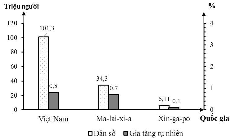 Câu 4. Cho biểu đồ: Dân số và gia tăng tự nhiên của một số quốc gia Đông Nam Á, năm 2024 (Số liệu theo Niên giám thống kê ASEAN 2025, https:...