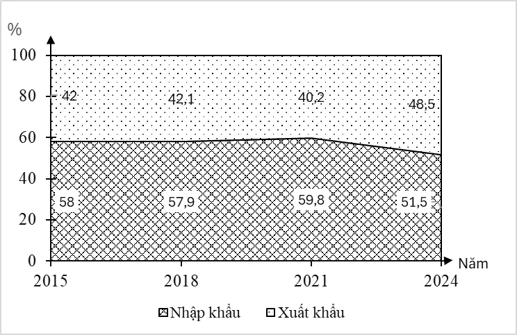 Câu 4 . Cho biểu đồ sau: CƠ CẤU XUẤT, NHẬP KHẨUCỦA CAM-PU-CHIA, GIAO ĐOẠN 2015-2024. a) Campuchia từ giai đoạn 2015 - 2024 vẫn luôn là nước...