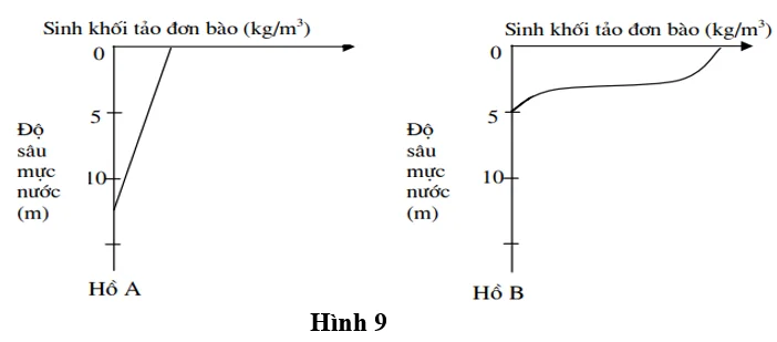 Câu 4. Hai hồ nuôi thủy sản A và B ở vùng đồng bằng có diện tích mặt nước và độ sâu tương đương nhau. Hồ A được quản lý tốt, thay nước định kỳ; hồ B nhận nhiều chất thải hữu cơ từ thức ăn dư thừa và phân động vật, dẫn đến hiện tượng tảo phát triển mạnh. Kết quả khảo sát cho thấy sinh khối tảo đơn bào theo chiều sâu của hai hồ khác nhau như thể hiện ở Hình 9.