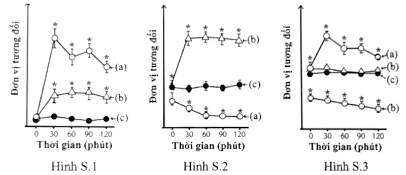 các thời điểm khác nhau (30, 60, 90, 120 phút) kể từ thời điểm uống dung dịch dinh dưỡng (0 phút). Hình S.1; S.2 và S.3 thể hiện hàm lượng glucose, insulin và glucagon trong máu của chuột thí nghiệm. Mỗi đường đồ thị [kí hiệu (a), (b), (c)] biểu thị một nhóm chuột uống một loại dung dịch dinh dưỡng. Dấu (*) thể hiện sự khác biệt có ý nghĩa thống kê giữa giá trị tại mỗi thời điểm phân tích so với thời điểm 0 phút trên cùng một đường đồ thị.