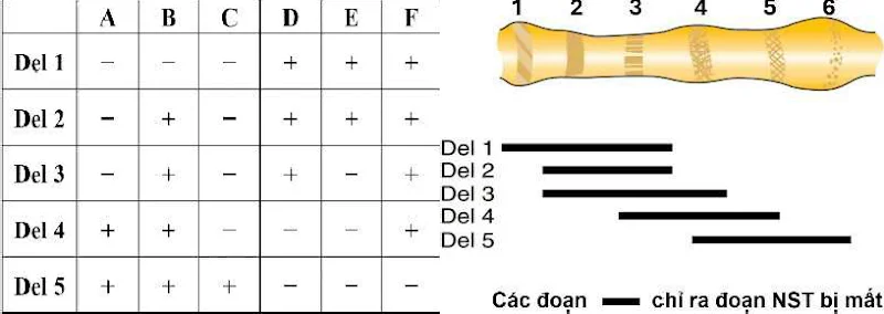 Câu 4. Hình sau đây mô tả 6 vị trí trên NST tuyến nước bọt và 5 đoạn NST bị mất do các đột biến mất đoạn khác nhau (từ Del 1 đến Del 5) của ruồi giấm Drosophila. Các locus gene A, B, C, D, E và F được biết là có mặt trong đoạn NST trên nhưng chưa rõ thứ tự của chúng. Theo dõi sự biểu hiện kiểu hình do allele trội quy định của các thể dị hợp có chứa chiếc NST mất đoạn (làm mất một hoặc một số allele trội) và chiếc NST tương đồng chứa toàn allele lặn sẽ thu được kết quả ở bảng sau (dấu “-” có nghĩa không biểu hiện còn dấu “+” có nghĩa biểu hiện). Các phát biểu sau đây đúng hay sai?