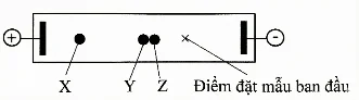 Kết thúc thí nghiệm, thu được kết quả mô phỏng trên bản điện di như hình dưới đây. Ba chấm X, Y, Z đại diện cho ba chất nói trên (không theo thứ tự). Các chấm Y và Z nằm khá gần nhau, trong khi X tách biệt hẳn về phía cực dương (+).