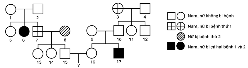 Câu 4. Phả hệ dưới đây mô tả hai bệnh di truyền phân li độc lập với nhau, mỗi bệnh do một gene quy định. Biết không xảy ra đột biến ở tất cả mọi người trong phả hệ.