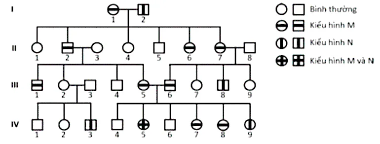 Câu 4: Phả hệ sau mô tả một gia đình có người biểu hiện kiểu hình M, N hoặc cả hai kiểu hình. Hai kiểu hình M và N thuộc hai tính trạng khác...