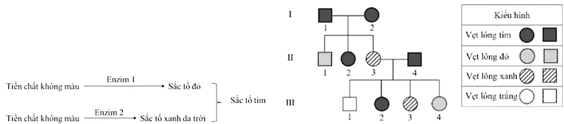 Biết rằng, enzyme 1 và enzyme 2 do 2 allele trội của 2 locus gene nằm trên 2 NST thường quy định. Allele lặn không tạo được enzyme có chức năng. Một nhà lai tạo thực hiện các phép lai. Kết quả được ghi nhận và thể hiện ở hình bên. Biết không có đột biến phát sinh. Theo lí thuyết, xác suất để cặp vẹt bố mẹ II.3 và II.4 sinh thêm được 1 vẹt con có lông tím là bao nhiêu %?
