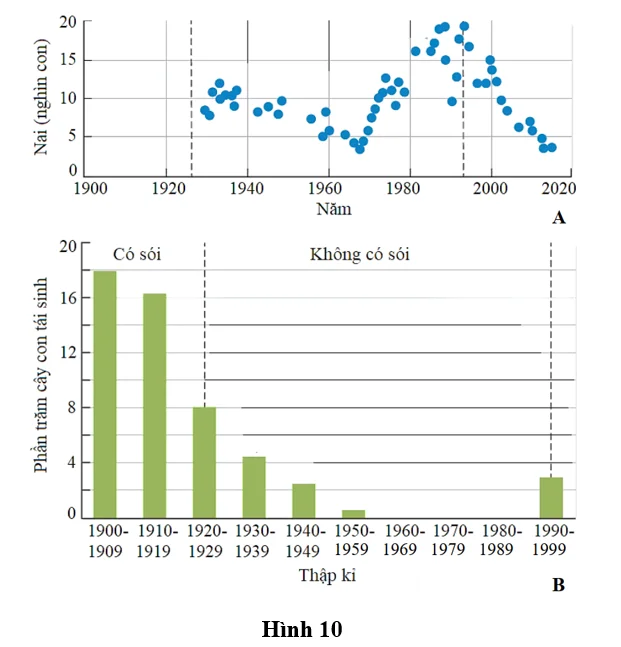 Câu 4. Sói xám (Canis lupus) ở vườn quốc gia Yellowstone bị con người săn bắn từ năm 1926 và dẫn đến tuyệt chủng ngay sau đó. Điều này có ảnh hưởng lớn đến cấu trúc quần xã trong đó tiêu biểu là số lượng nai sừng tấm (Alces sp) (Hình A), làm ban quản lí rừng phải chủ động giết bớt nai khỏi khu vực (liên tục đến năm 1968 - khi quần thể nai đạt số lượng tương đối thấp mới dừng lại) và số lượng thực vật trong rừng (Hình 10, tỉ lệ thuận với lượng cây con tái sinh). Năm 1995, người ta quyết định nhập thêm 14 cá thể sói xám từ Canada sau 70 năm vắng bóng loài động vật ăn thịt ở vùng đất này.