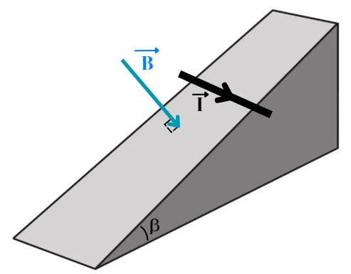 Câu 4: Sử dụng đoạn dây dẫn và từ trường đều có độ lớn cảm ứng từ trung bình đã xác định ở Câu 3. Người ta thiết kế một hệ thống đường ray dẫn điện đặt trên mặt phẳng nghiêng, hợp với phương ngang một góc β = 30o. Vector cảm ứng từ có phương vuông góc với mặt phẳng nghiêng như hình bên dưới. Đặt đoạn dây dẫn lên mặt phẳng, hệ số ma sát giữa đoạn dây và mặt phẳng là µ = 0,1.Biết khối lượng của đoạn dây dẫn là m = 10 g, lấy g = 10 m/s2. Để đoạn dây bắt đầu trượt lên trên theo mặt phẳng nghiêng thì cường độ dòng điện chạy qua dây phải có độ lớn tối thiểu là bao nhiêu A? (Làm tròn kết quả đến chữ số hàng phần trăm)