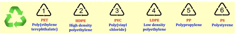 Câu 5. Cho các vật liệu polymer thuộc loại chất dẻo mô tả như hình dưới đây. Các polymer này có thể tái chế được, các kí hiệu này thường được in trên bao bì, vỏ hộp, đồ dùng,... để giúp nhận biết vật liệu polymer cũng như thuận lợi trong việc thu gom và tái chế.