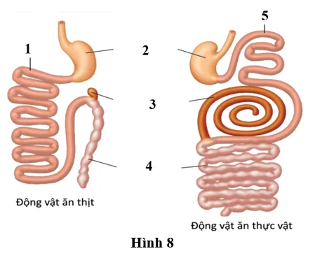 Câu 5. Hình 8 ảnh dưới đây so sánh cấu tạo hệ tiêu hóa của động vật ăn thịt (bên trái) và động vật ăn thực vật (bên phải). Các đơn vị cấu trúc được đánh số từ 1-5 tương ứng với các cơ quan trong hệ tiêu hóa của các nhóm động vật trên.